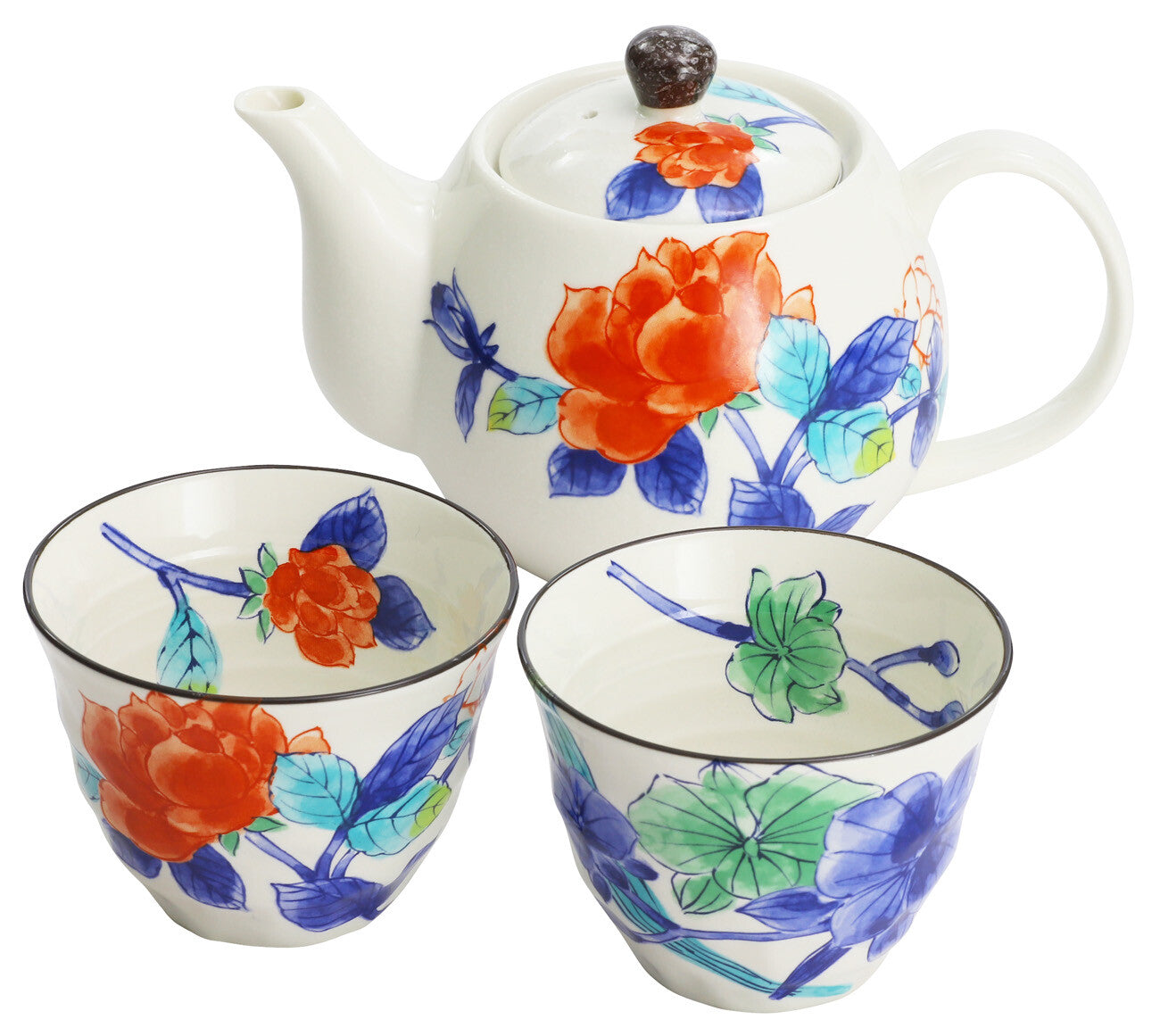 *茗燒與愛禮品[景泰藍花]。這對禮品套裝包括兩個煎茶碗和一個壺。